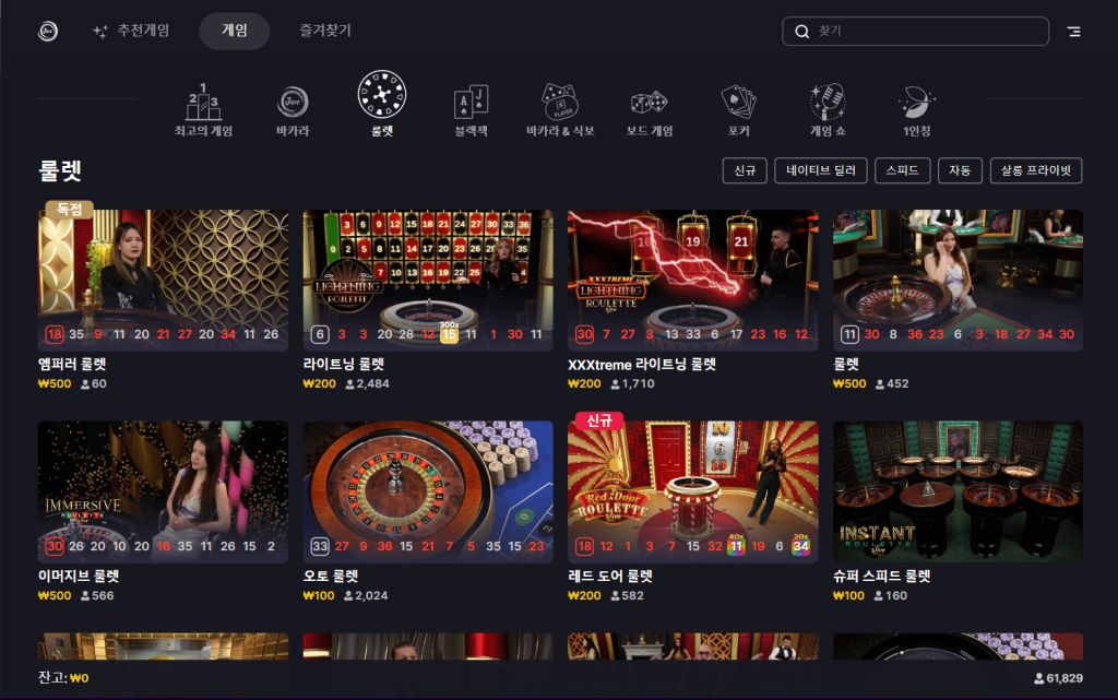 게임사에 접속하여 좌측상단에 게임을 선택하고 룰렛을 클릭하면 룰렛게임들만 보여줍니다. 룰렛에는 일반 룰렛부터 스피드 룰렛, 라이트닝 룰렛, 프라이빗 룰렛 등 다양한 형태의 룰렛이 있습니다. 가장 기본적인 룰렛부터 몇가지 간단한 추가 기능을 가진 룰렛들까지 차례대로 알아보도록 하겠습니다. 먼저 4번째 게임에 보이는 룰렛을 선택하여 게임의 기본셋팅을 보겠습니다.