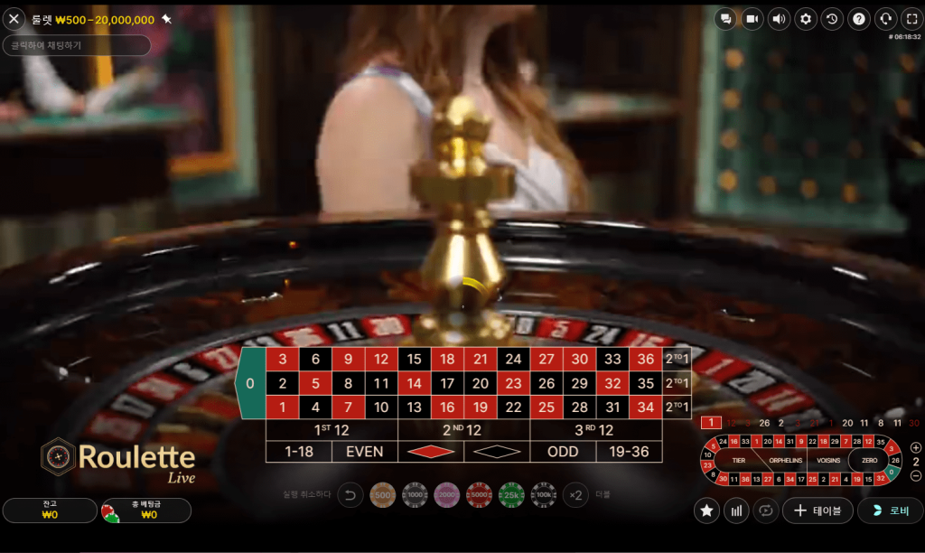 게임은 간단합니다. 딜러가 룰렛 휠을 회전시키고 공을 룰렛 휠에서 반대 방향으로 회전시키며 일정기간의 베팅시간이 주어집니다. 베팅시간동안 플레이어는 최적의 베팅을 하여 공의 착지점을 예측하는 게임입니다. 화면 왼쪽 상단에 룰렛이라는 방 이름이 있으며 베팅은 500원 부터 2천만원까지 가능합니다. 화면 하단 중앙에 게임칩을 선택하여 그 위에 있는 룰렛 베팅판에 베팅을 해주는 형식입니다. 인사이드 베팅 부터 설명하면, 숫자의 중앙에 칩을 올리면 스트레이트 베팅이며, 두 번호를 나누는 경계선에 칩을 올리면 한개의 칩으로 두 번호에 베팅하는 스플릿 베팅이 됩니다. 네가지 번호가 만나는 코너에 칩을 올리면 네개의 번호에 배팅하는 코너베팅이 됩니다. 아웃사이드 베팅에는 열에 포함된 12개의 번호에 보두 적용되는 컬럼베팅, “1st 12” 이 적힌 하단부에 베팅하여 12가지 번호를 선택하는 더즌 베팅, 레드/블랙 색상에 배팅하는 컬러베팅, 짝수나 홀수에 베팅하는 짝/홀 베팅, 1-18/19-36 에 배팅하여 18가지 번호를 모두 선택하는 베팅 등 다양한 베팅이 있습니다.