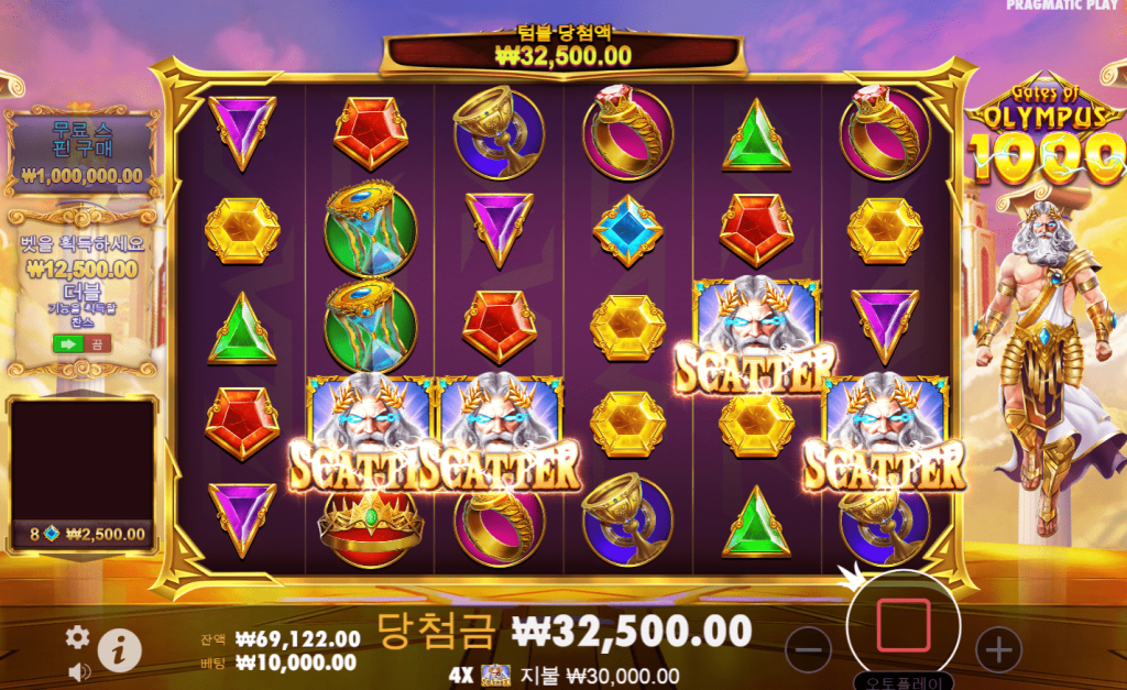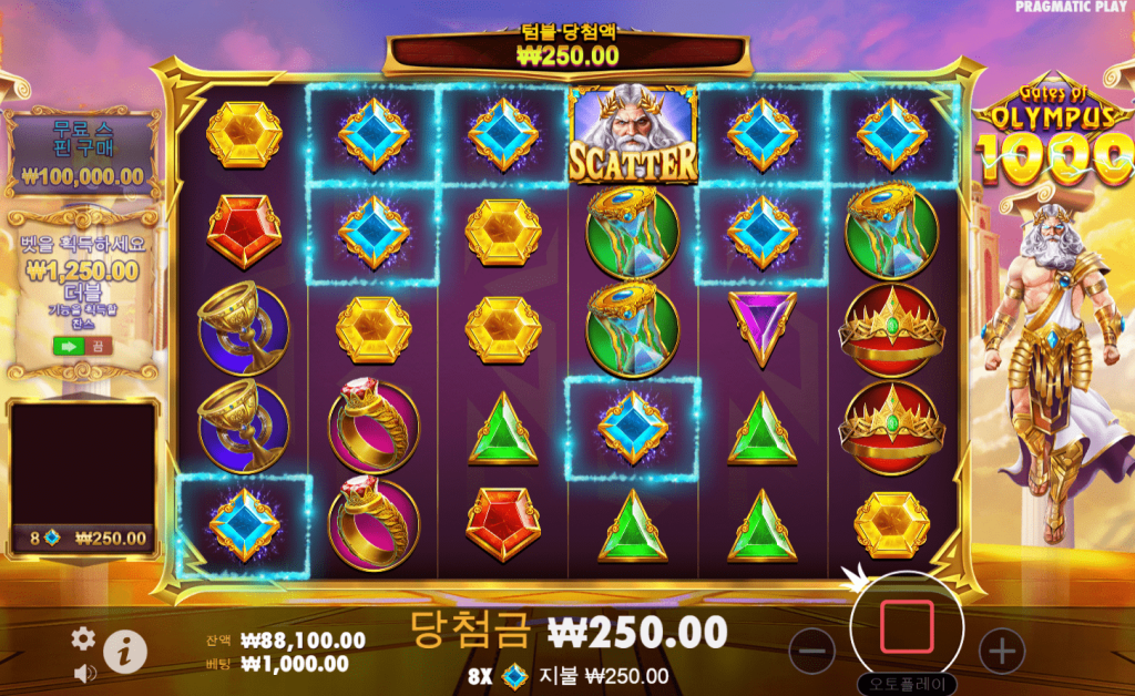 게임사에 접속하면 여러가지 게임들이 보입니다. 그 중에서도 대중적인 게이트 오브 올림푸스 라는 게임을 선택해 설명을 진행해 보도록 하겠습니다. 해당 게임은 라인을 조절할 필요 없이 배팅금액을 설정하고 스핀을 돌리기만 하면 자동으로 배당금을 계산해서 돌려주기 때문에 초보자들도 누구나 즐길 수 있는 게임입니다. 그러나 중요한 것은, 어떻게 배당금이 지급 되는가를 아는 것이 중요하다는 점입니다. 이 점을 숙지하고 게임을 즐기신다면 2배 더 즐거운 게임이 되실 것입니다. 인 게임 화면을 통해 더 알아보도록 하겠습니다.
