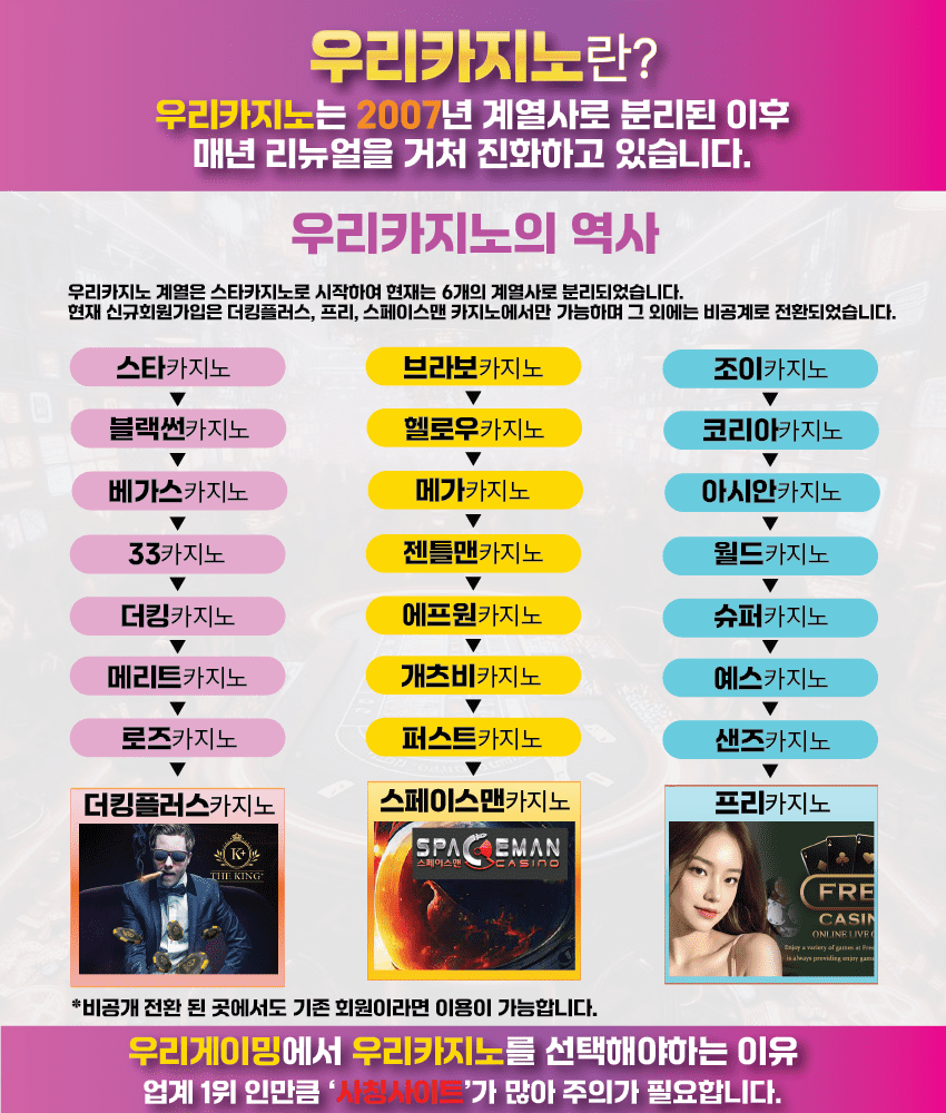 우리카지노 계열은 2007년 W카지노를 시작으로 다양한 카지노 브랜드를 선보여왔습니다. 6개의 계열사로 분리되어 지금까지 총 42개의 브랜드를 론칭 하였습니다. 회원 관리 제도를 처음 도입하였으며 이 회원 관리 제도는 카지노 업계에 귀감이 되어 지금과 같은 현재의 문화가 생기게 되었습니다. 우리카지노란 하나의 사이트 이름이 아닌 계열사 전체를 통합하는 명칭입니다. 대표적으로는 더킹카지노, 샌즈카지노, 메리트카지노, 프리카지노, 007카지노가 있습니다. 우리카지노의 독점 영상 SA(살롱)게이밍과 HO(호)게이밍 외에도 최근 카지노 이용자들에게 많은 호평이 쏟아지고 있는 에볼루션 게이밍,프라그마틱 플레이도 제공합니다.